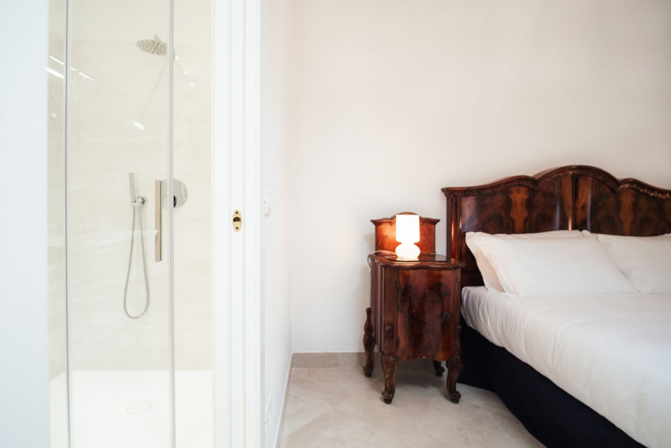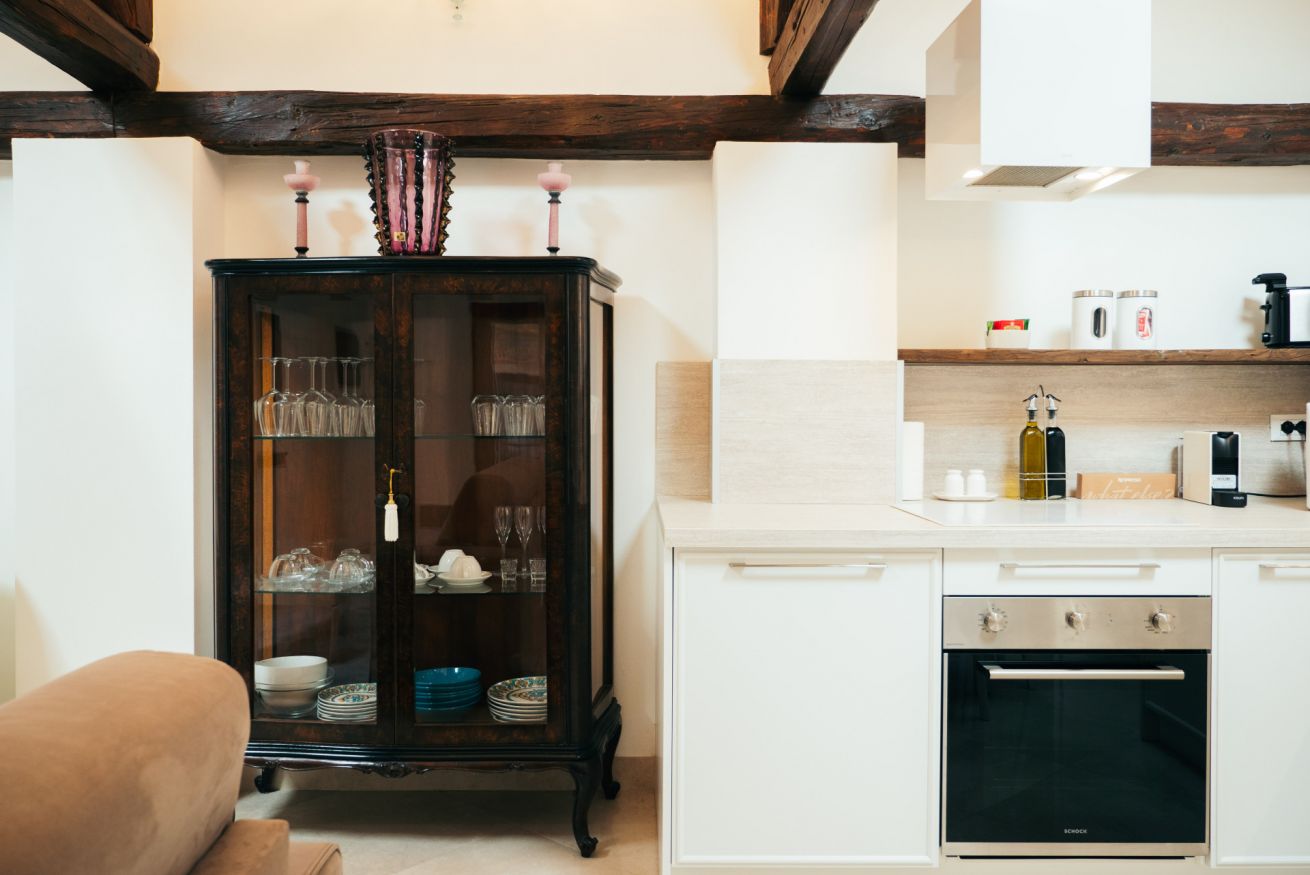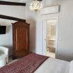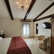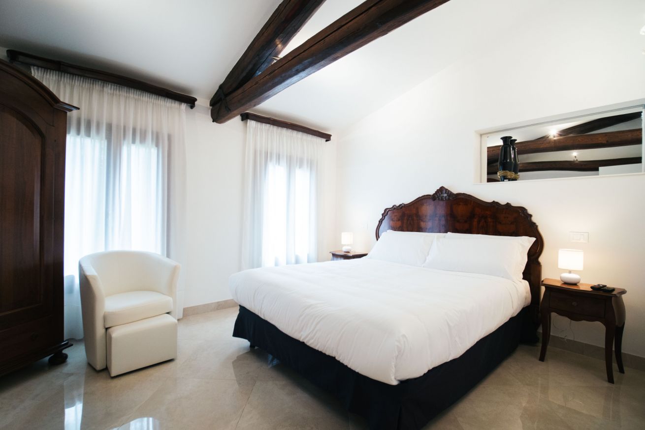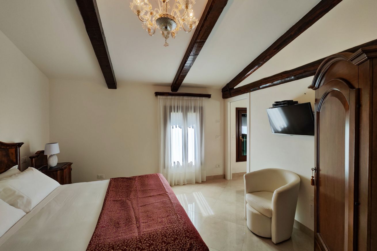 La Suite dotata di cinque finestre e di tre lucernai con velux , che la rendono piena di luce, è ampia e spaziosa, curata nei minimi dettagli, con arredamento vintage, magnifici lampadari d’epoca ed oggetti di vetro di Murano , specificatamente selezionati da Mazzega glass Factory. Unisce sapientemente il fascino dell’antico con il moderno.