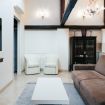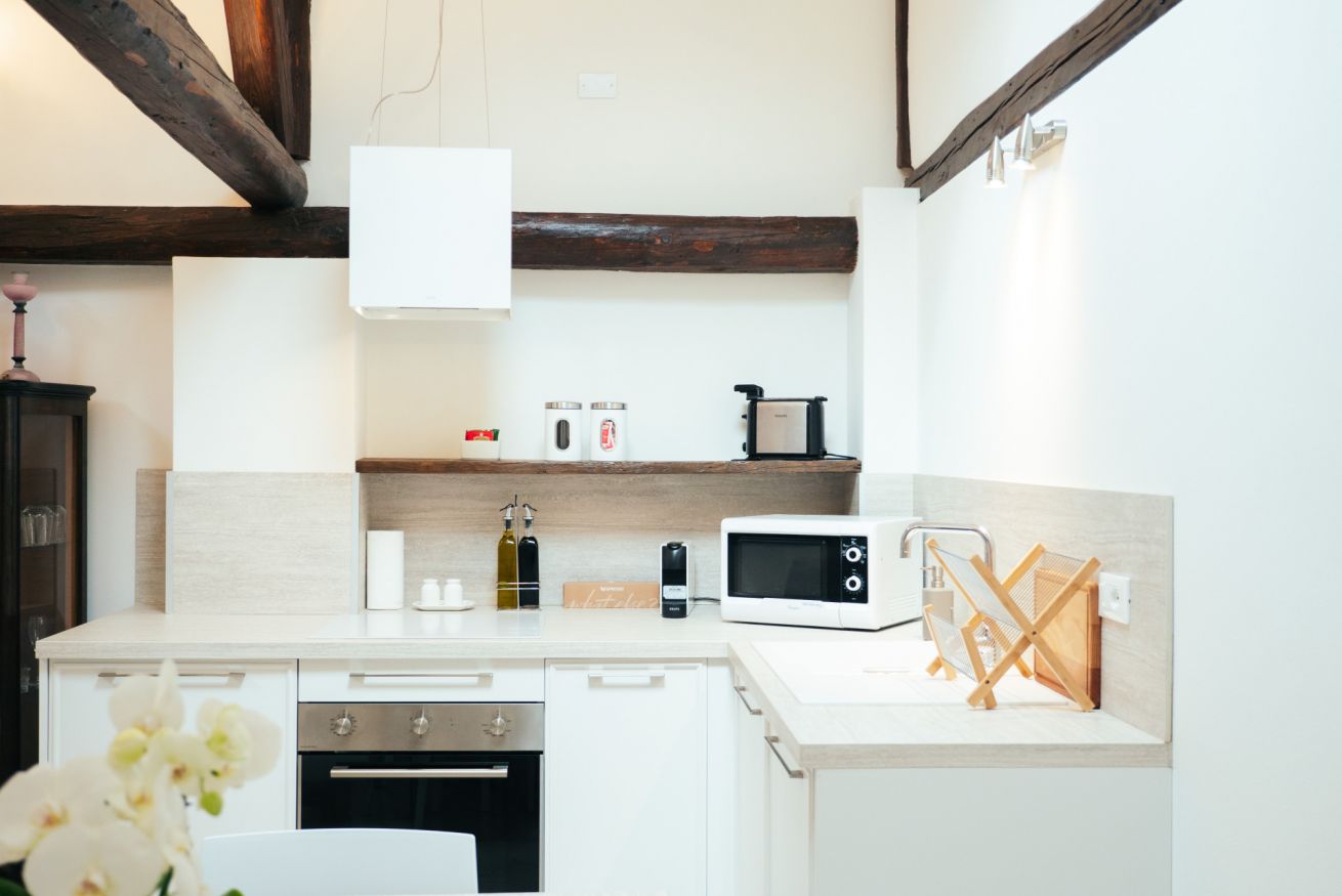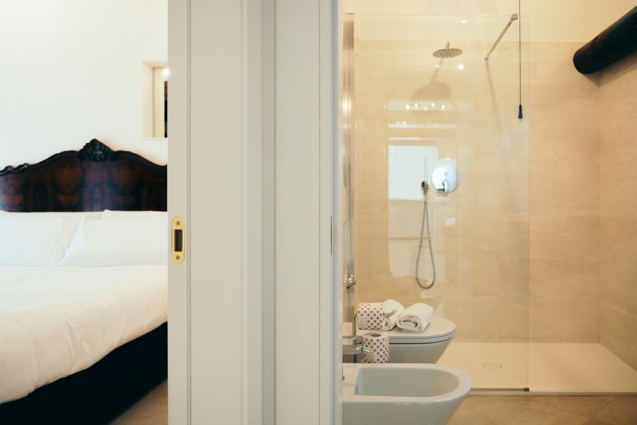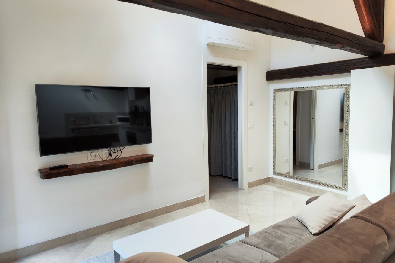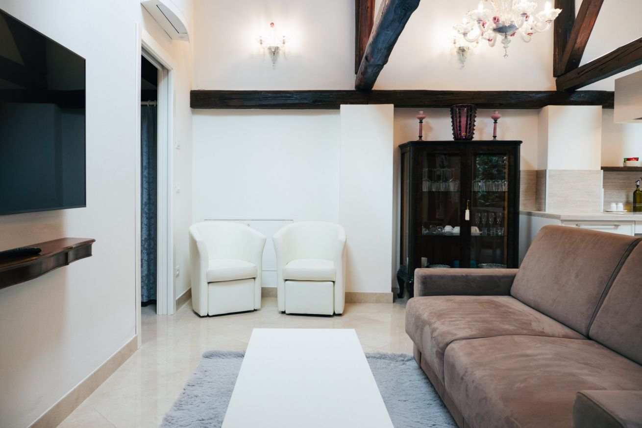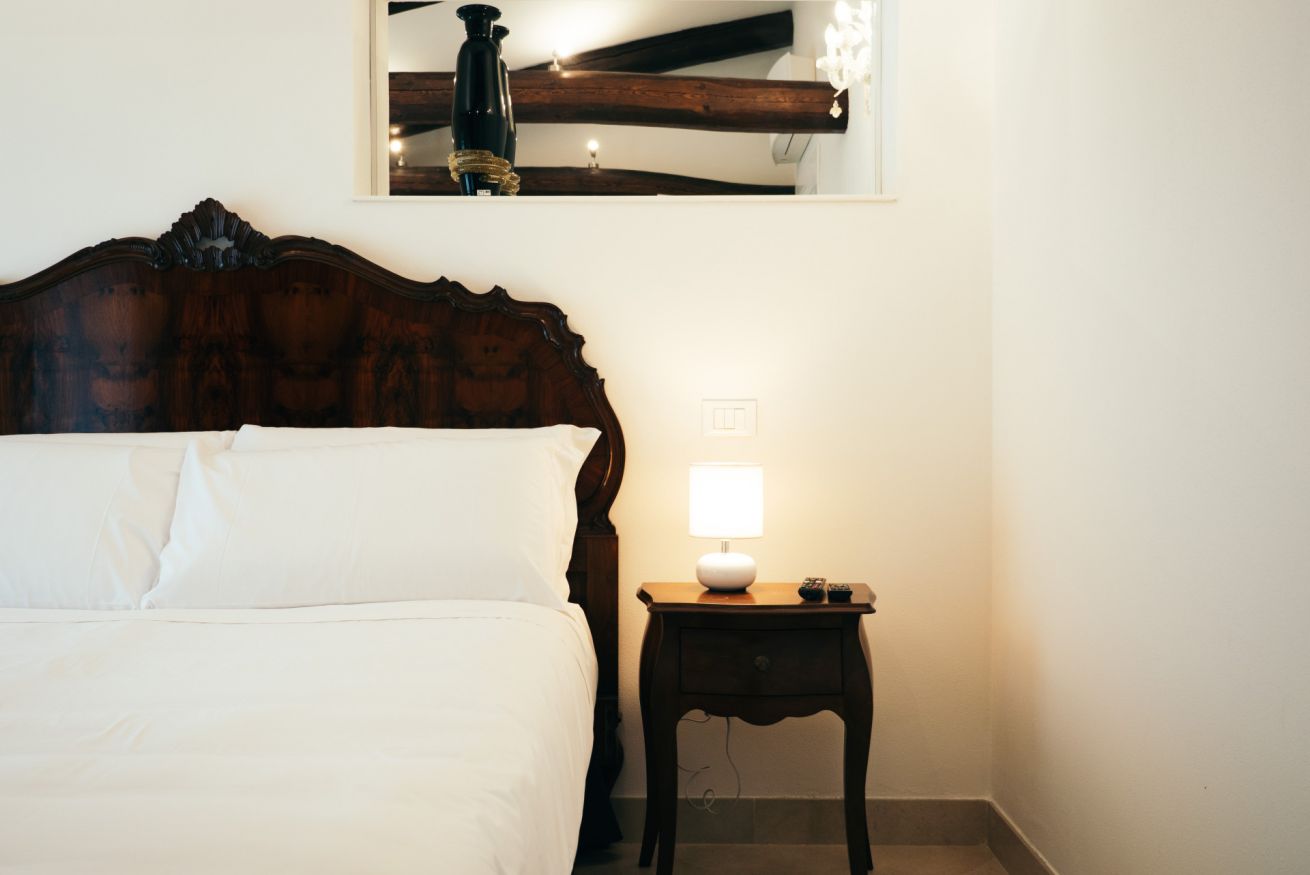 La Suite dotata di cinque finestre e di tre lucernai con velux , che la rendono piena di luce, è ampia e spaziosa, curata nei minimi dettagli, con arredamento vintage, magnifici lampadari d’epoca ed oggetti di vetro di Murano , specificatamente selezionati da Mazzega glass Factory. Unisce sapientemente il fascino dell’antico con il moderno.